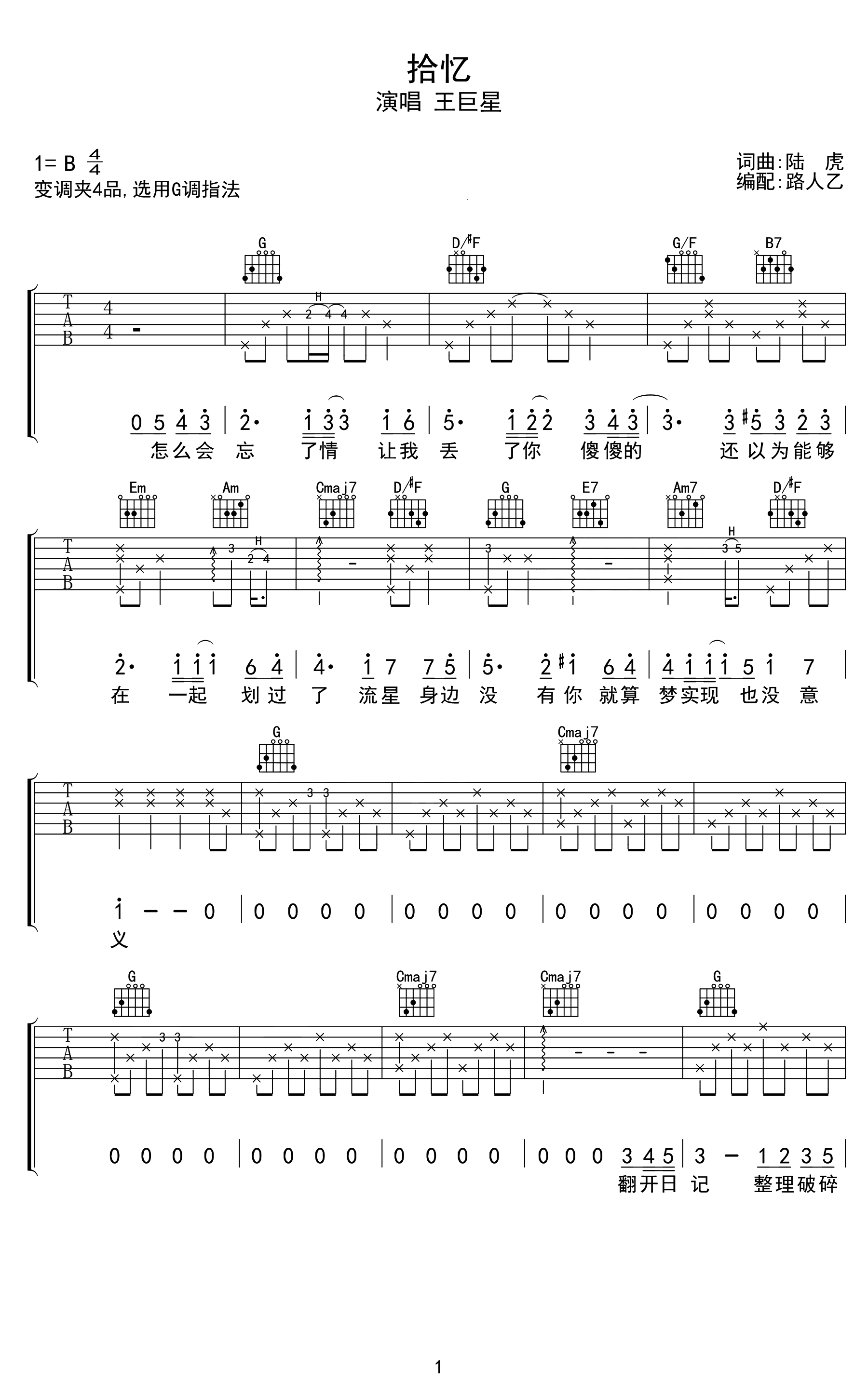 王巨星《拾忆》吉他谱,一起去看流星雨主题曲,张翰原唱,拾忆六线谱,原调B,变调夹夹四品,选用G调指法因为这部偶像剧剧当年难以预料地爆火,《拾忆》也成了这部剧中的经典代表插曲,一听到这首歌,相信很多人就会想起这部剧,一部剧加一首曲,包含了很多人那些年对爱情的所有幻想,浓浓的画面感和...