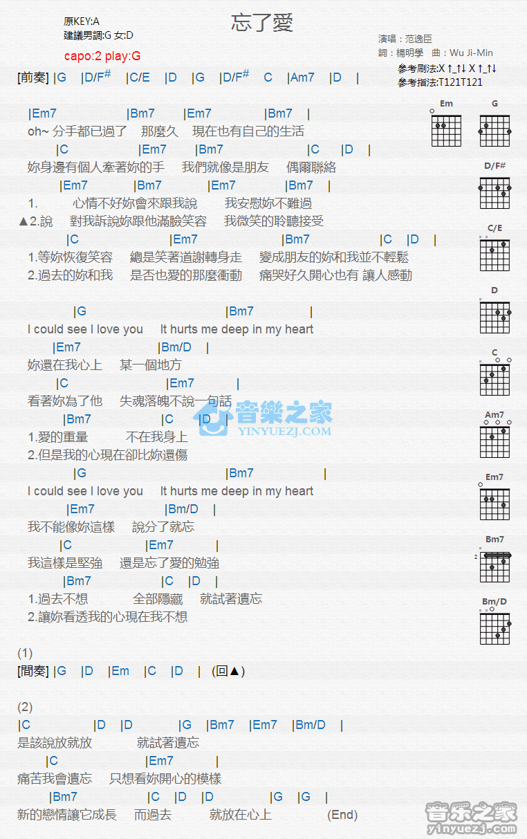 G调版范逸臣《忘了爱》吉他和弦弹唱谱...