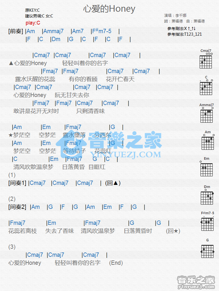 C调版李千娜《心爱的Honey》吉他和弦弹唱谱...