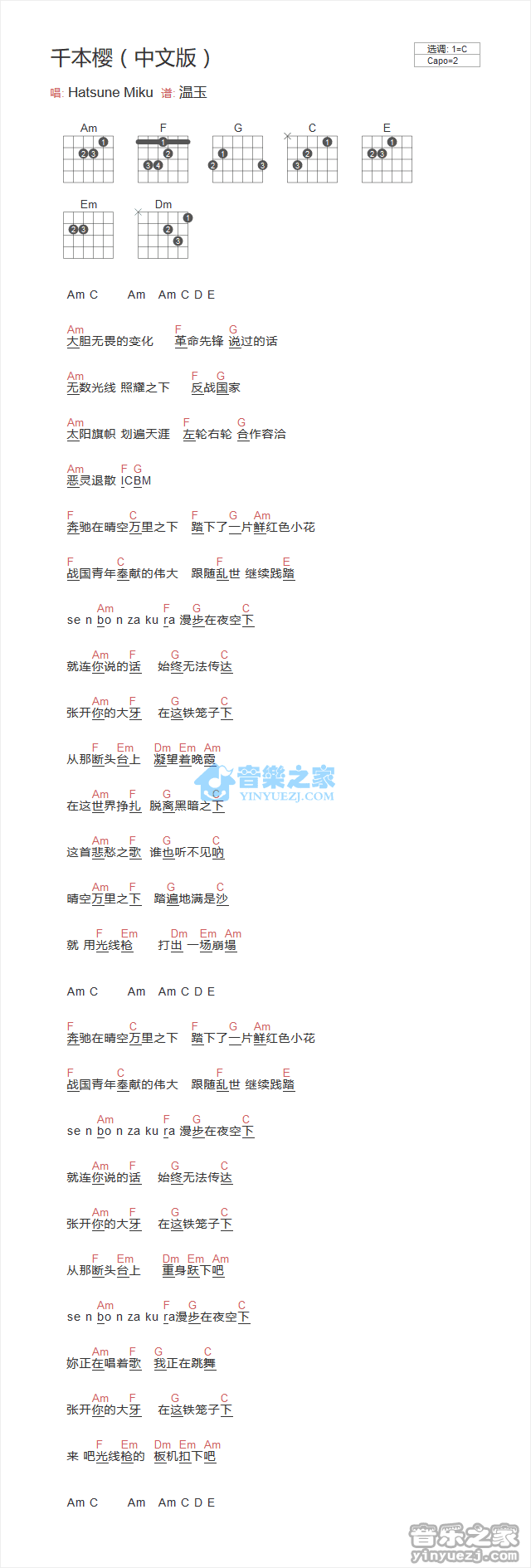 C调版《千本樱中文版》吉他和弦弹唱谱...