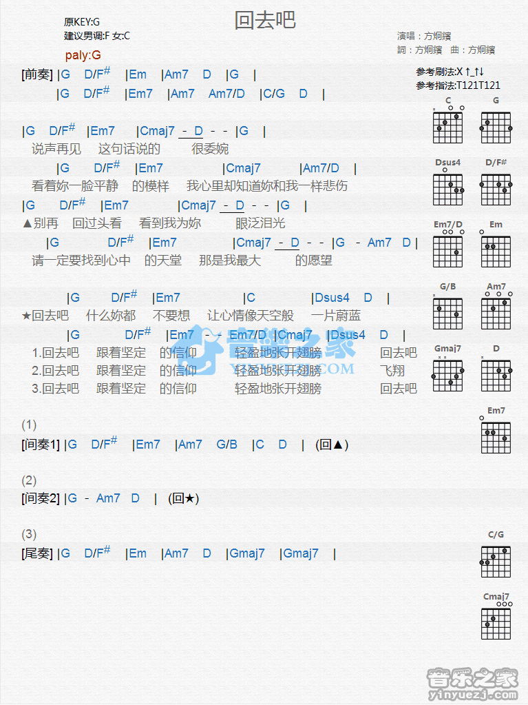 吉他方炯镔《回去吧》吉他谱 - 很多人都在弹的版本