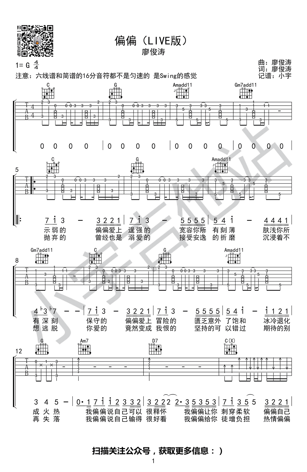 吉他 廖俊涛《偏偏》吉他谱 - 很多人都在弹的版本