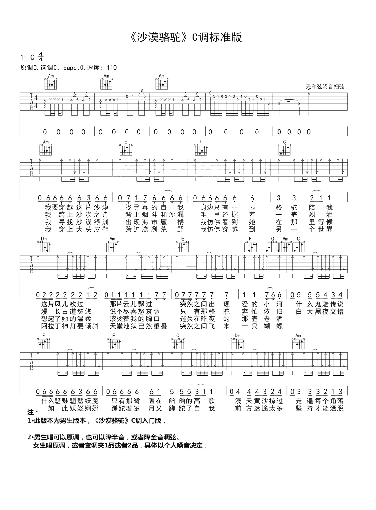 沙漠骆驼吉他谱,C调入门版,男生调弹唱谱,可以降半音或降全音调弦,女生根据个人嗓音决定变调夹1-2品。展展与罗罗的一首热门网络歌曲,沙漠骆驼吉他弹唱谱,人生的沙漠荒芜浩瀚、向往那风沙漫天中勇往前行骆驼,不惧孤独艰险,承载着希望与自我,追寻那片心中的绿洲。...