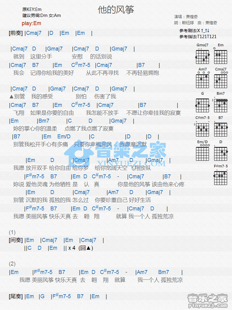 Em调版《他的风筝》吉他和弦弹唱谱...