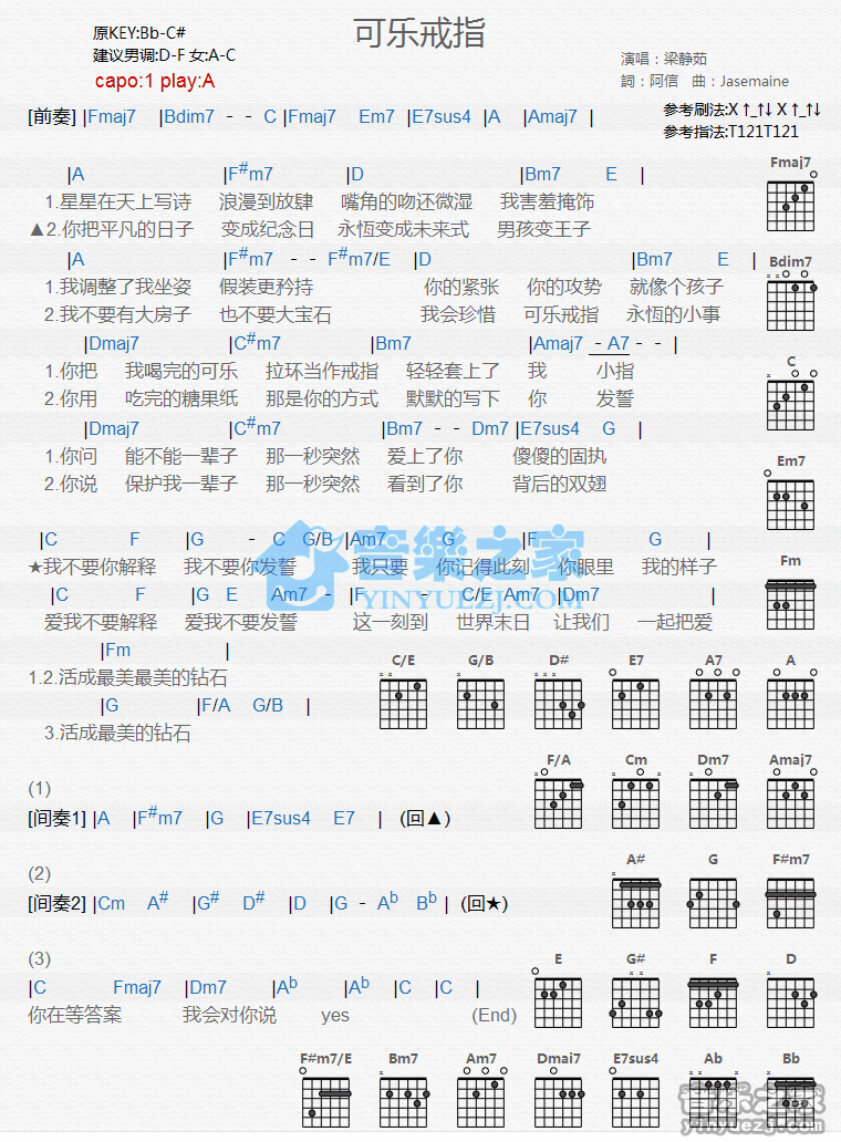 A调版《可乐戒指》吉他和弦弹唱谱...