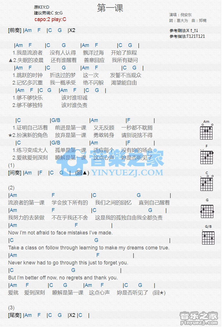 C调版倪安东《第一课》吉他和弦弹唱谱...