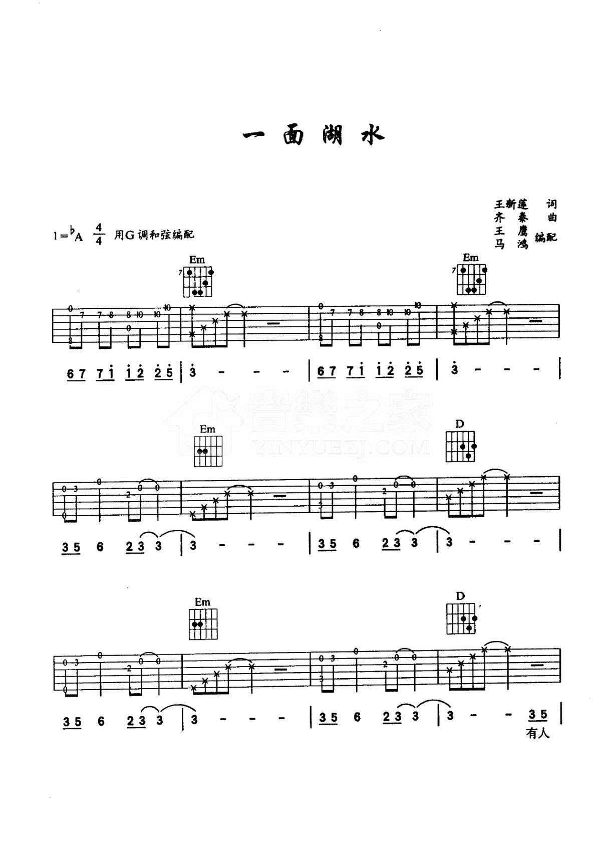 G调版齐秦《一面湖水》吉他弹唱六线谱...