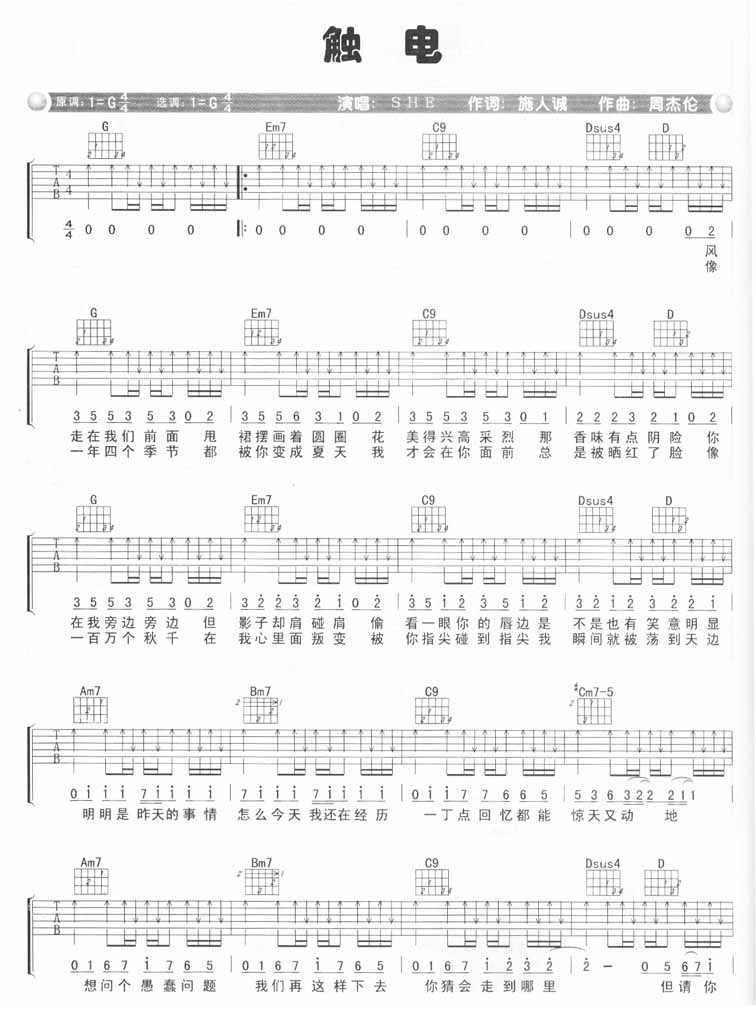 S.H.E《触电》吉他谱_G调吉他弹唱谱...