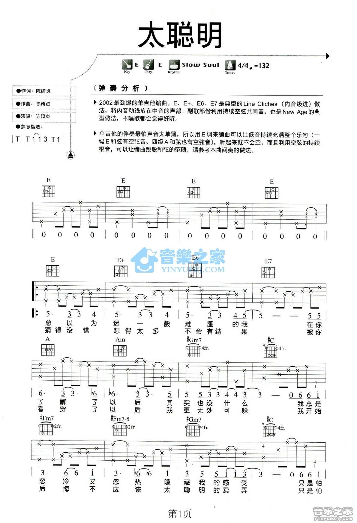 卢家宏E调版陈绮贞《太聪明》吉他弹唱六线谱...