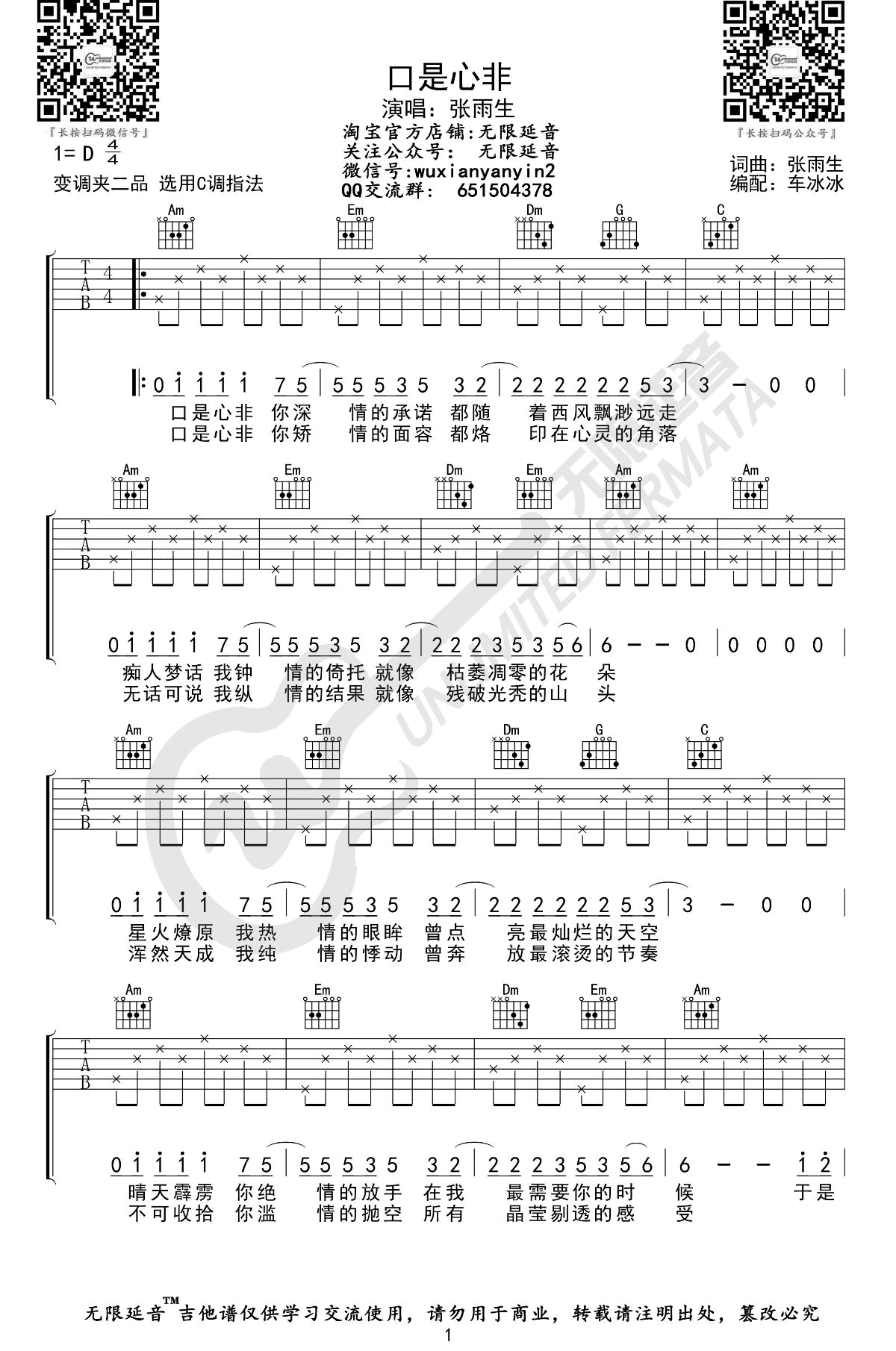 口是心非吉他谱,张雨生的一首摇滚风格的经典绝唱,因翻唱再次火爆网络。口是心非吉他六线谱,原调D选调C,变调夹夹二品,这是张雨生的最后一张专辑的主打歌,爱恨交错人消瘦,一字一句中间都潜藏着敏感而浓烈的情感,唱出了那种言不由衷,爱情和爱人不由人努力就能把握的伤感和无奈。...
