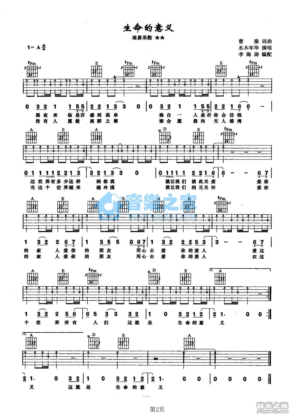 A调版水木年华《生命的意义》吉他弹唱六线谱...