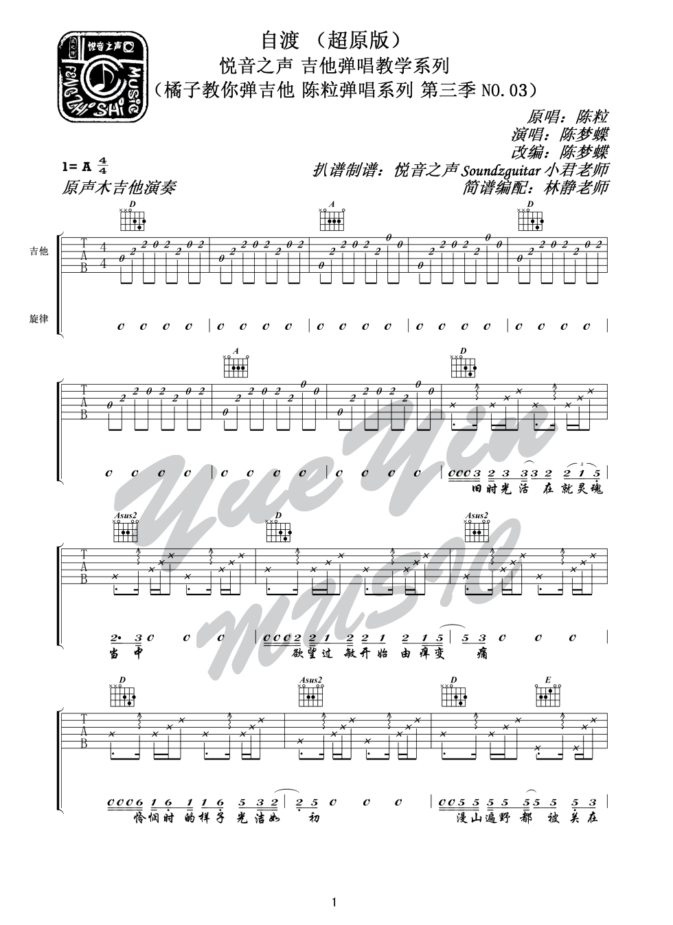 自渡吉他谱,陈粒演唱,A调指法原声木吉他演奏,...
