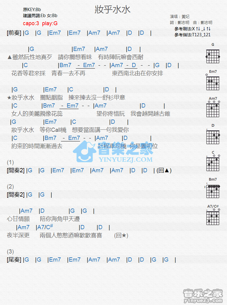 G调版黄妃《妆乎水水》吉他和弦弹唱谱...
