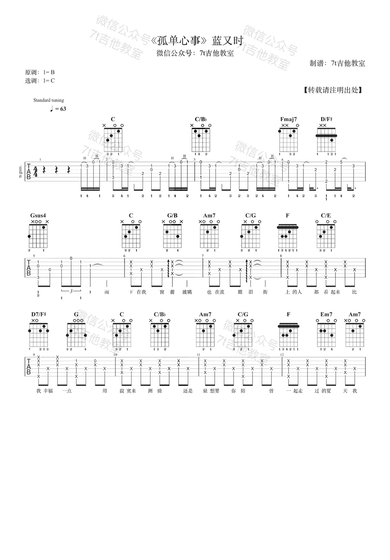 吉他蓝又时《孤单心事》吉他谱 - 小编推荐练习
