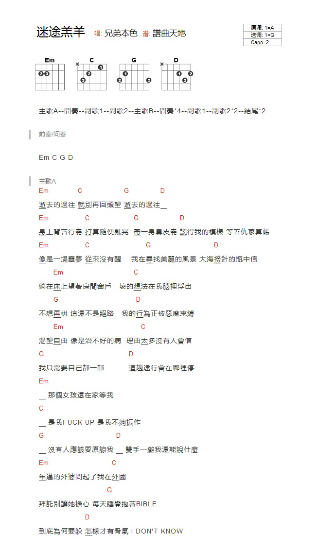 兄弟本色《迷途羔羊》吉他谱,共有2张高清图谱,免翻页排版设计。...
