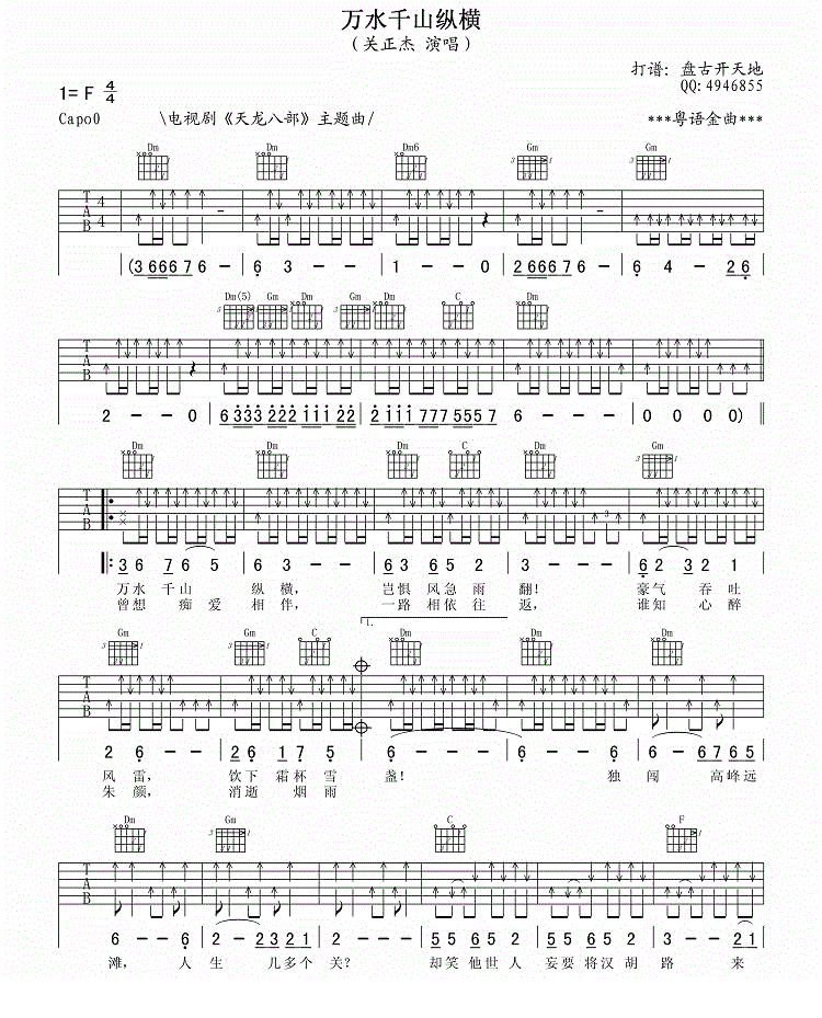 本曲谱为关正杰的一首豪气万种英雄柔肠的歌曲,《万水千山纵横》也是电视剧天龙八部系列中最出色的主题曲。喜欢粤语歌曲的朋友们,相信对这首歌都非常熟悉。...