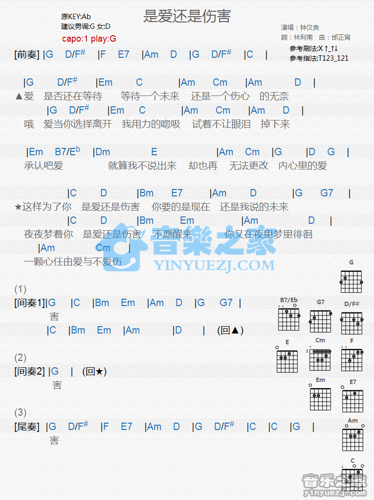 G调版《是爱还是伤害》吉他和弦弹唱谱...