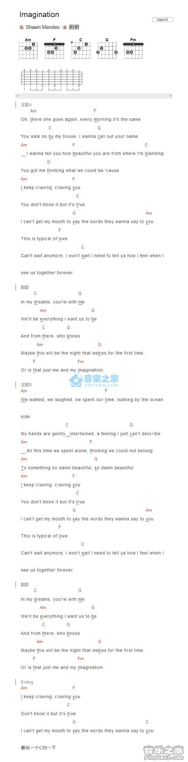 ShawnMendes《Imagination》吉他和弦弹唱谱...