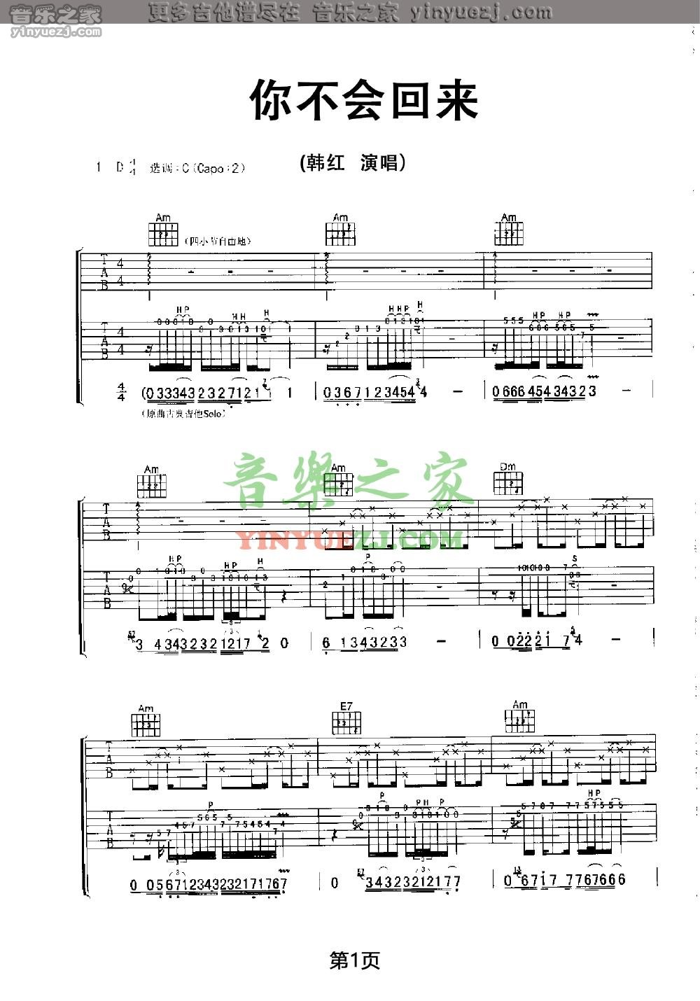 韩红《你不会回来》吉他谱,YYZJ编配出品,共有5张高清图谱。...
