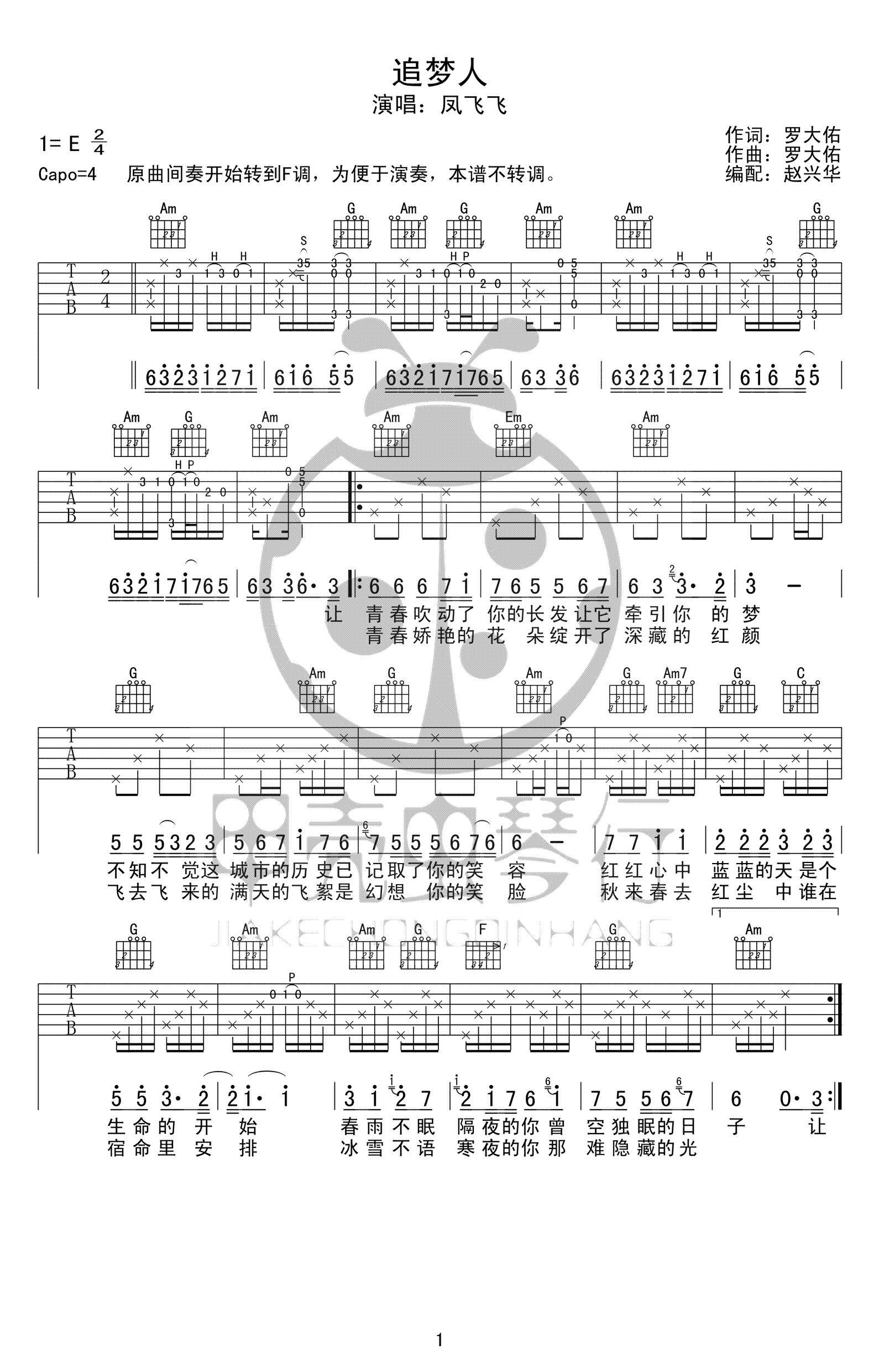 吉他凤飞飞《追梦人》吉他谱 - 推荐版本