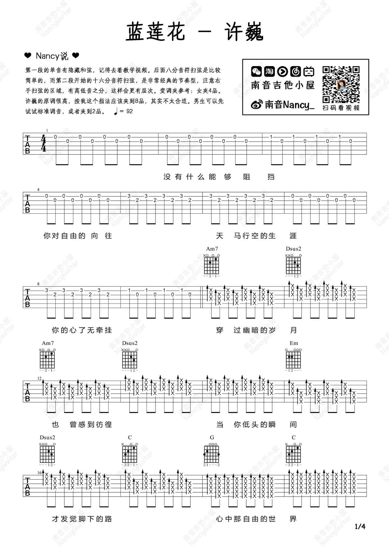 许巍《蓝莲花》吉他谱,南音吉他编配出品,共有4张高清图谱。...