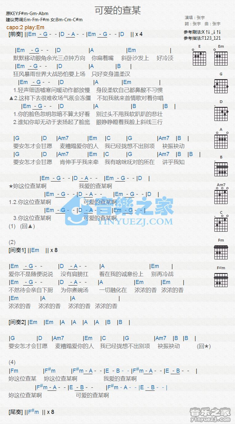 Em调版张宇《可爱的查某》吉他和弦弹唱谱...