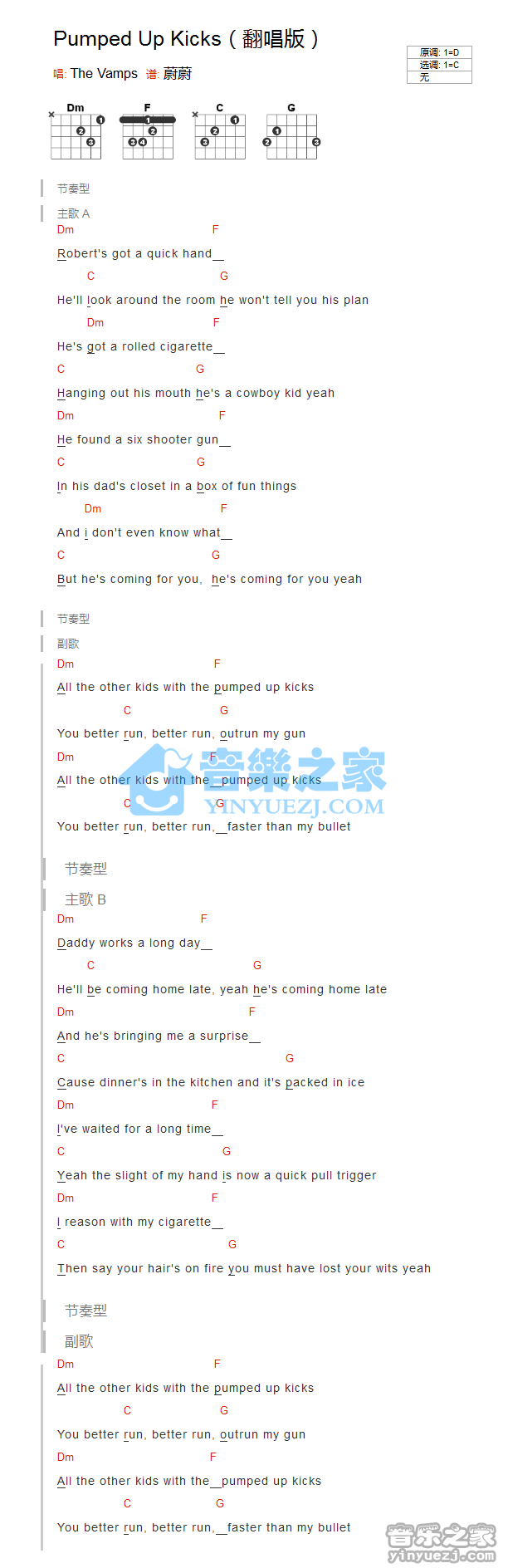 TheVamps《PumpedUpKicks》吉他谱,YYZJ编配出品,共有1张高清图谱,免翻页排版设计。...