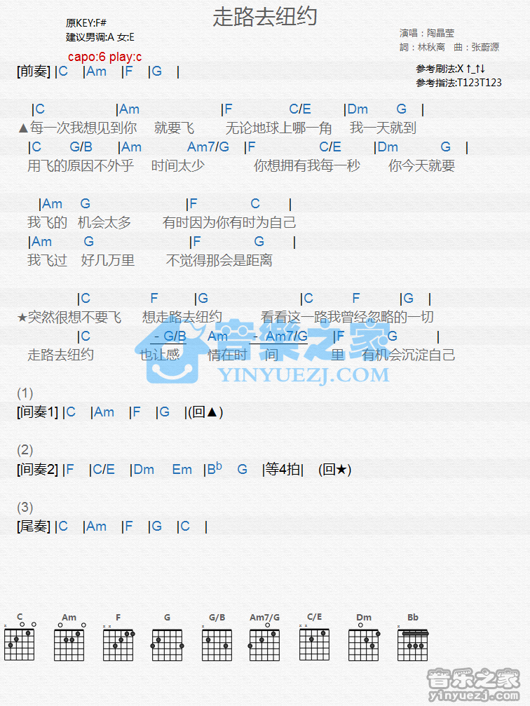 C调版《走路去纽约》吉他和弦弹唱谱...