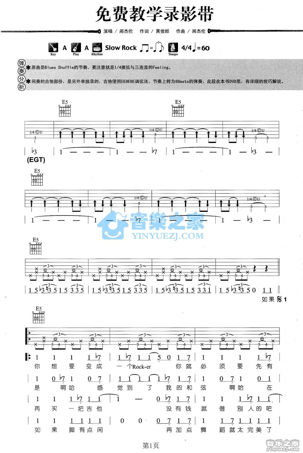 A调双吉他版周杰伦《免费教学录影带》吉他弹唱六线谱...