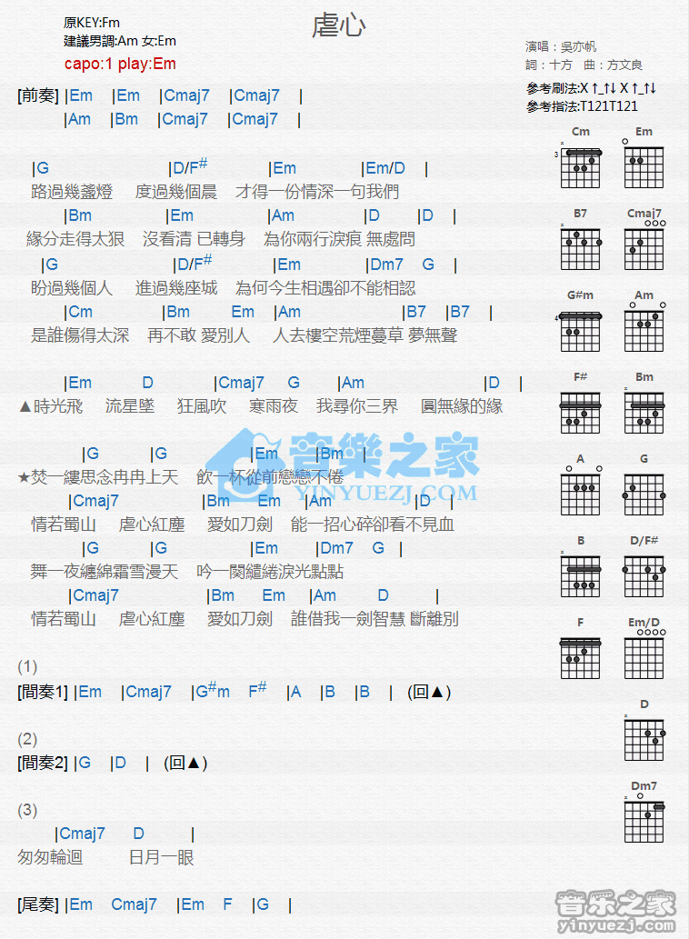 Em调版吴亦帆《虐心》吉他和弦弹唱谱...