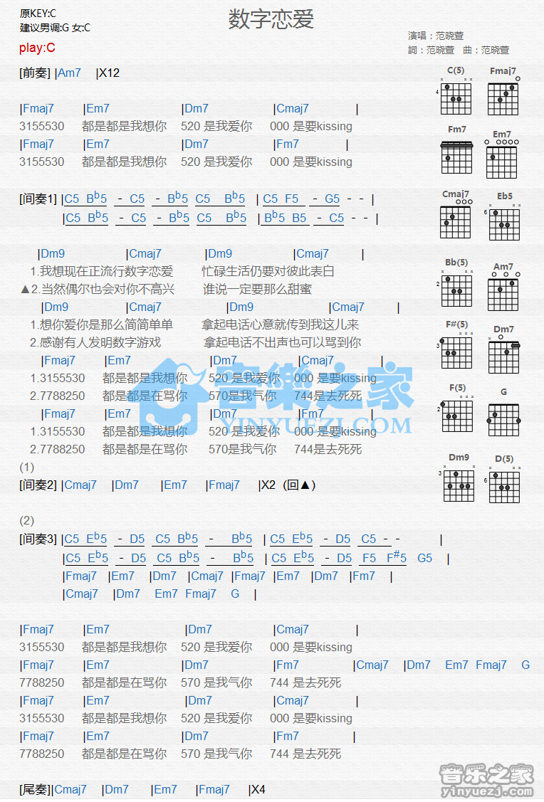 吉他范晓萱《数字恋爱》吉他谱 - 好听到爆炸