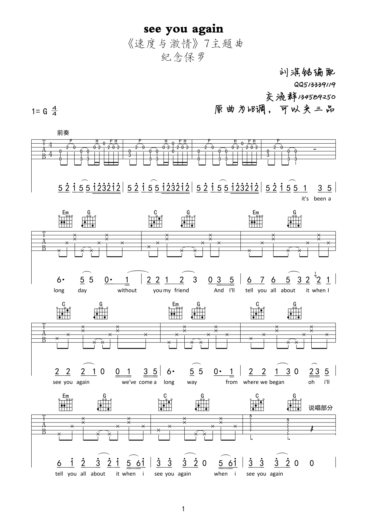 吉他速度与激情7片尾曲《see you again》吉他谱 - 免费版