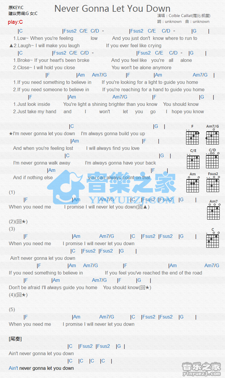 C调版ColbieCaillat《NeverGonnaLetYouDown》吉他和弦弹唱谱...