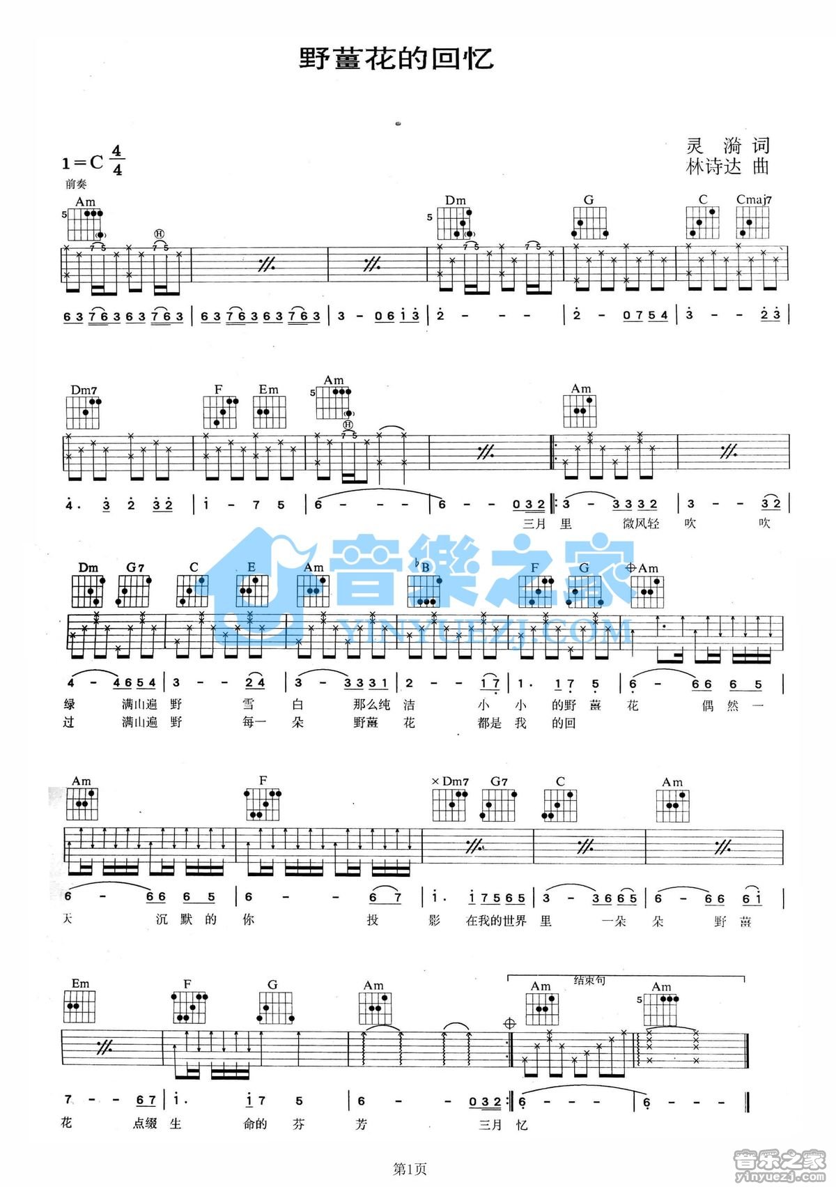 C调版刘蓝溪《野姜花的回忆》吉他弹唱六线谱...