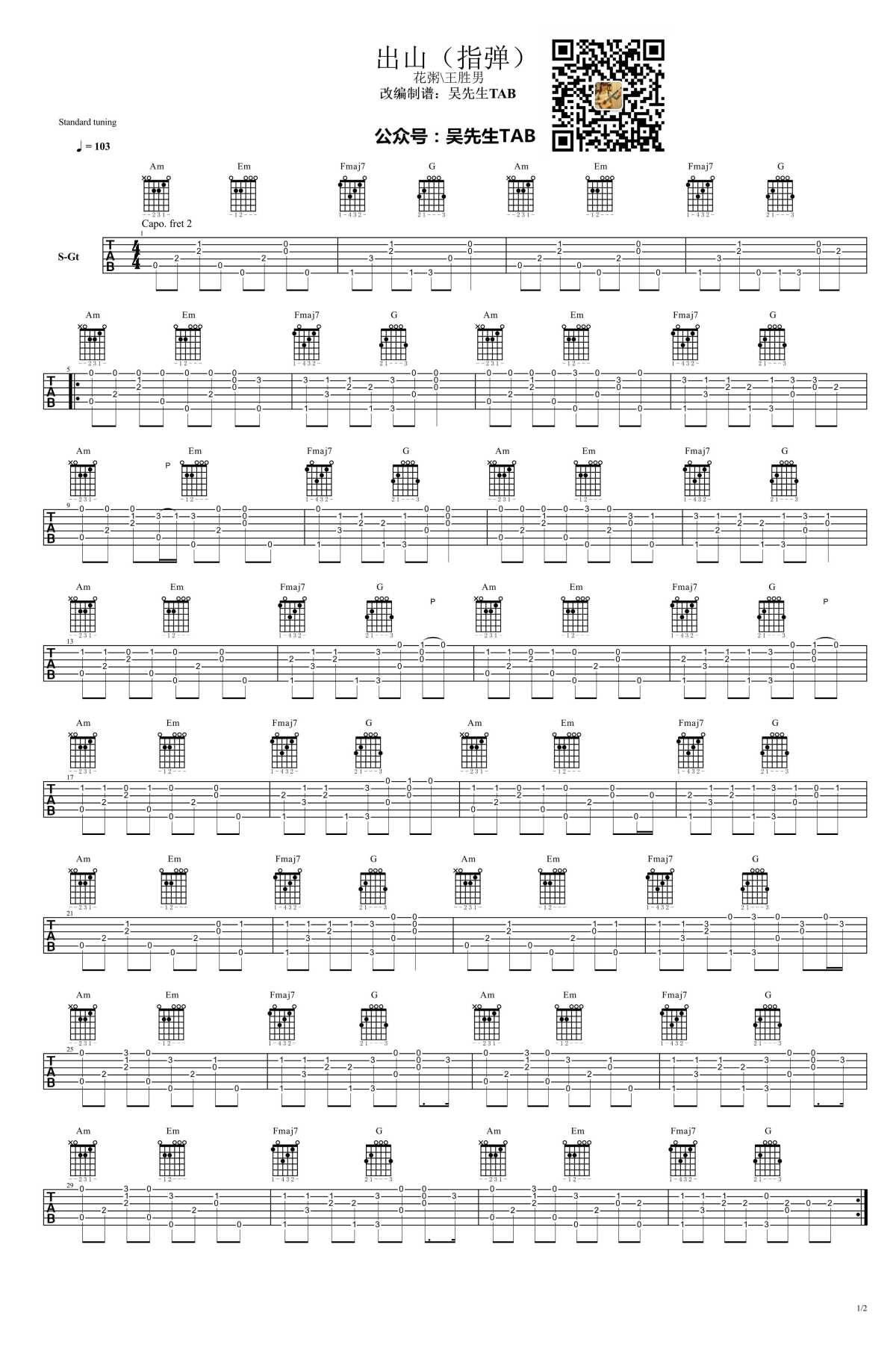 出山吉他谱指弹版,花粥演唱,很多同学都问过我要出山的指弹谱,因为原曲是降A调,常见的编配是用G调的指法,改编成指弹不是很好改编,现在改编的这个版本是用C调的指法,变调夹可夹可不夹,随意就好。...