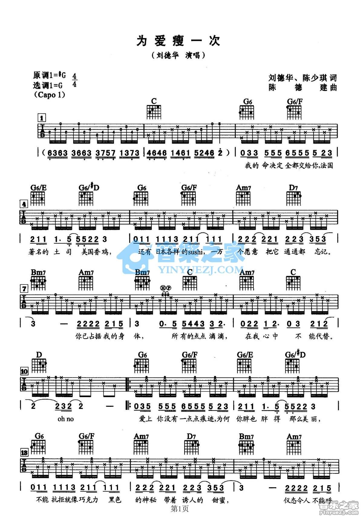 G调版刘德华《为爱瘦一次》吉他弹唱六线谱...