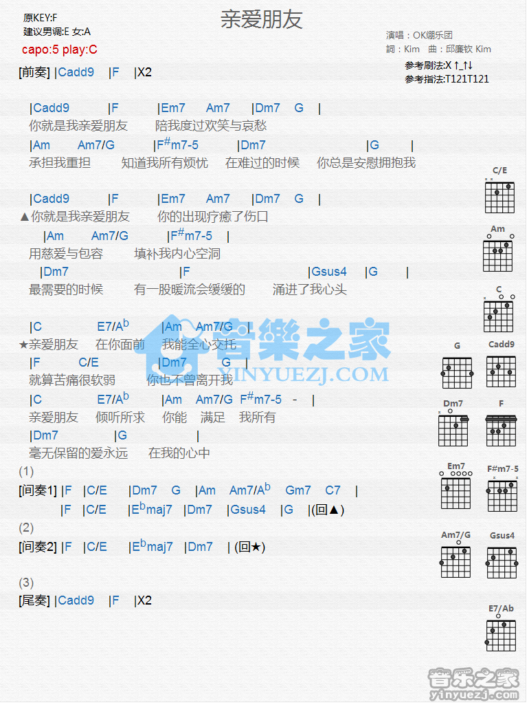 C调版《亲爱朋友》吉他和弦弹唱谱...