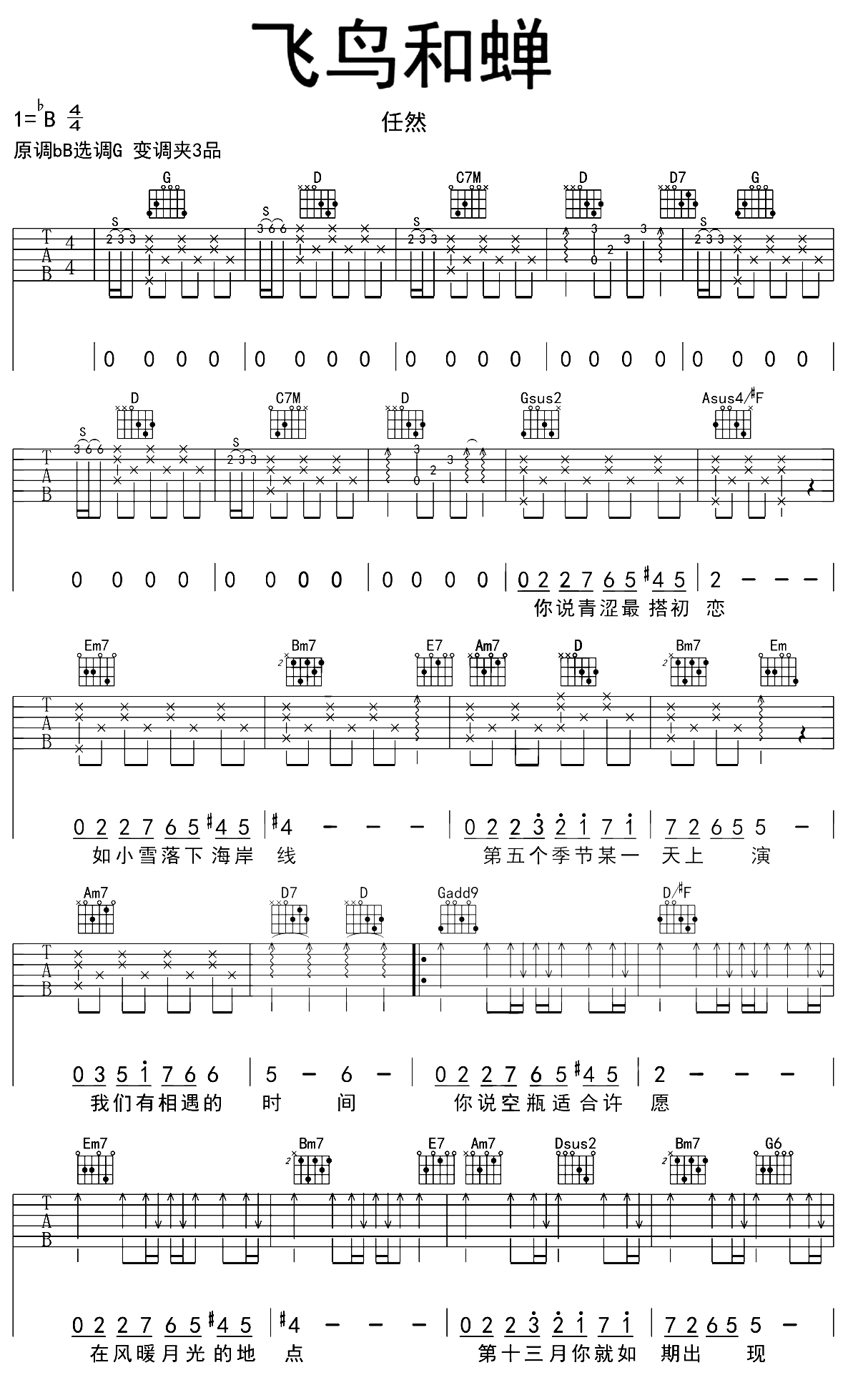 任然《飞鸟和蝉》吉他谱_G调吉他弹唱谱_原版...