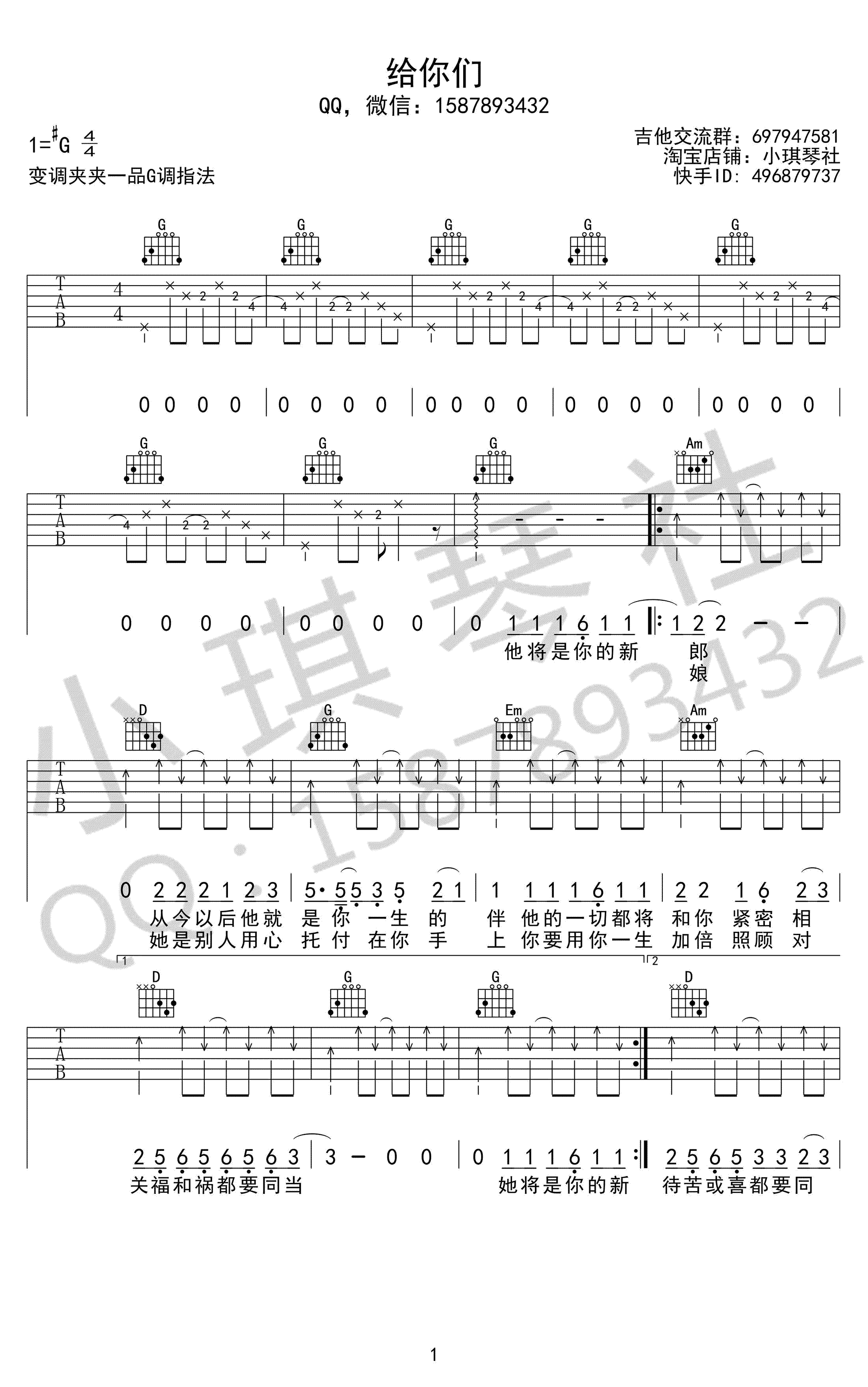 张宇《给你们》吉他谱,G调指法弹唱谱。张宇的一首经典感人的结婚神曲祝福情歌,给你们六线谱,小琪琴社编配出品,吉他天下网站上传推荐。爱情是两个人相互扶持和体谅,一首婚礼上很合适的音乐,每次听都很幸福感伤,相信每一对牵手的人都很憧憬这样的场面吧。...
