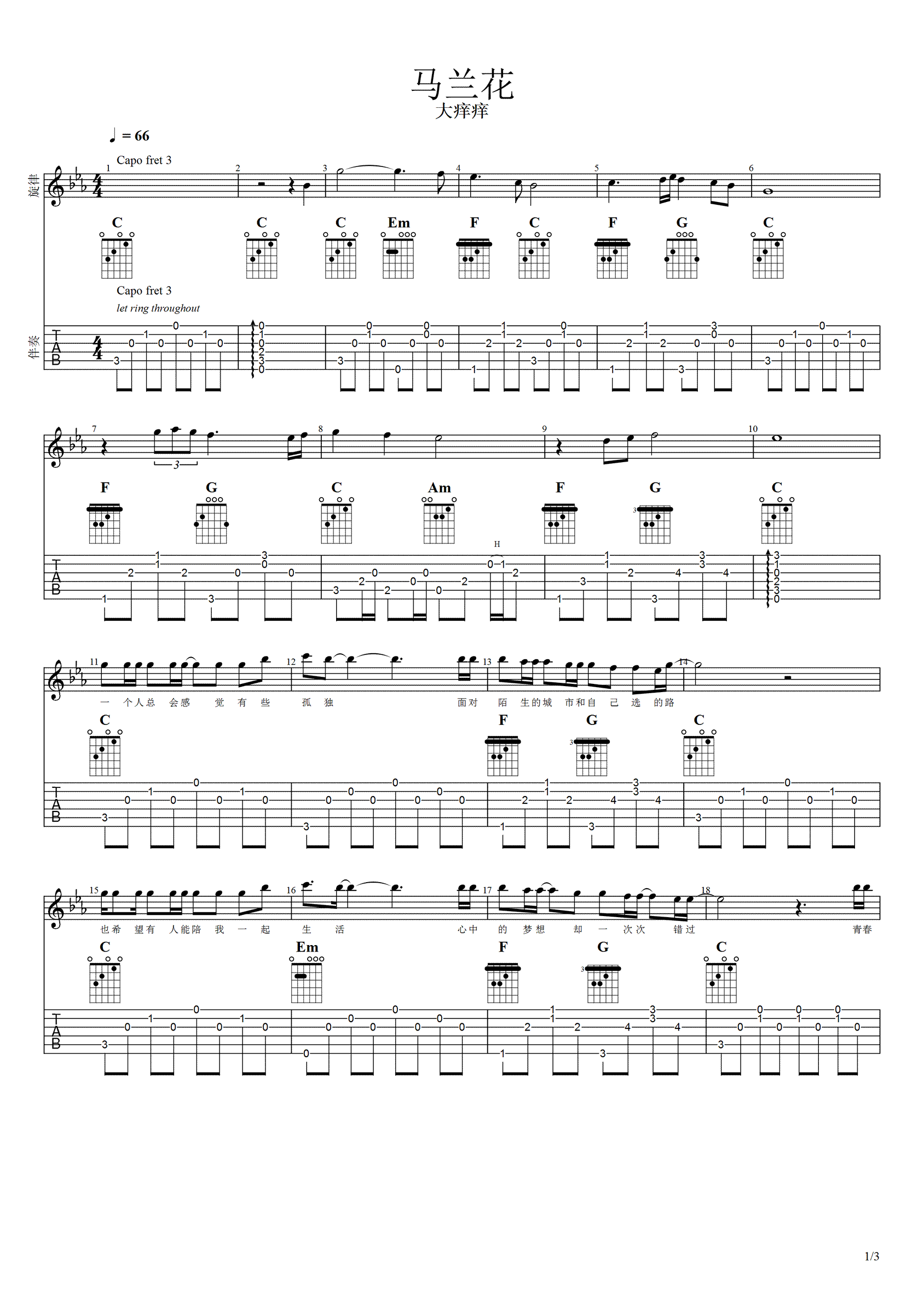 大痒痒马兰花吉他谱,变调夹夹三品。一首好听的民谣歌曲,曾几何时,我们是否已忘记,那些儿时的回忆?清澈的眼睛,曾经好奇地注视;不安份的心,曾经藏了多少秘密?青春确是一本难懂的书,但是小树也会长成大树!少壮需努力,就算摔跤也是幸福!曾经拥有就不会孤独!...