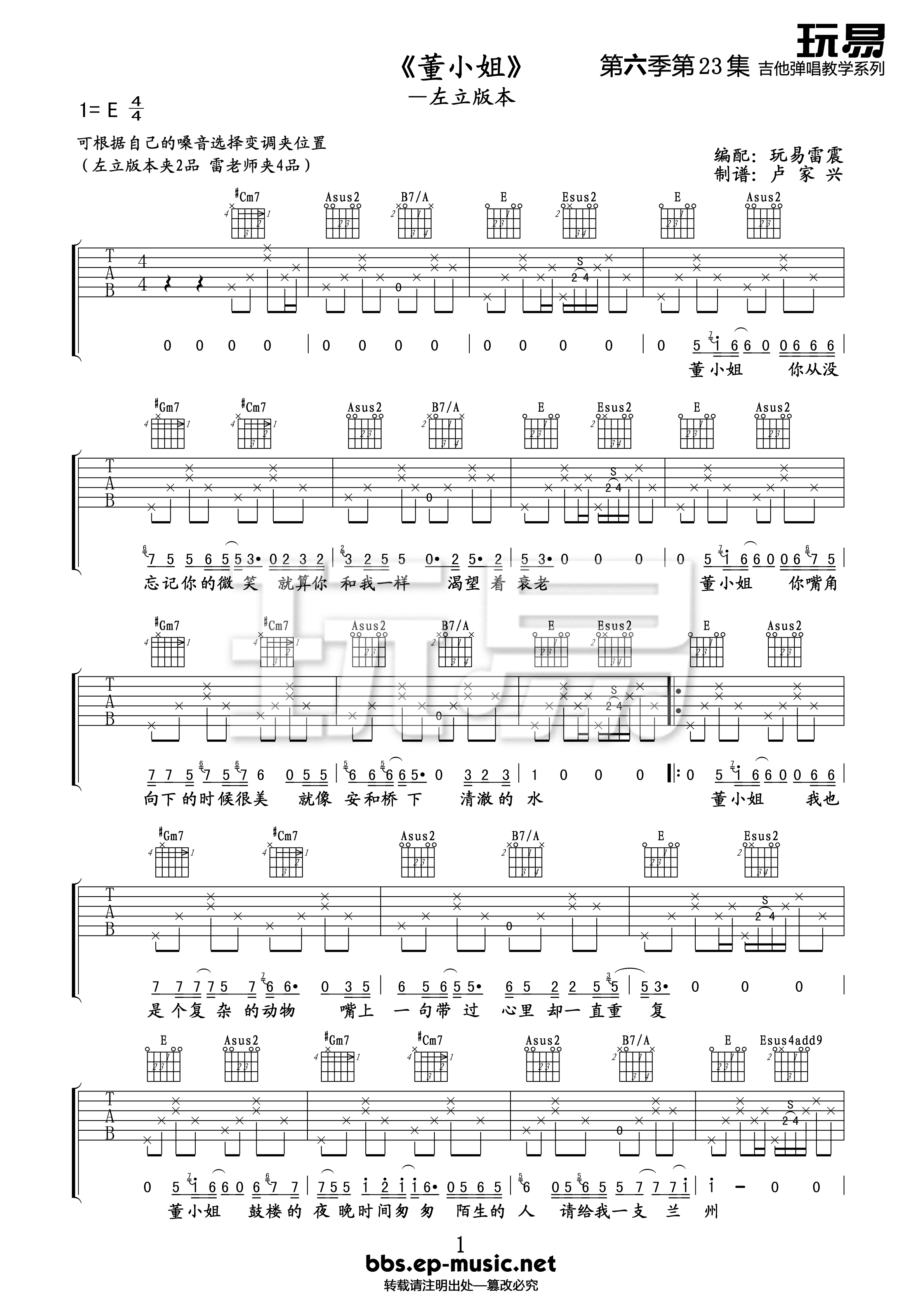 宋冬野《董小姐》吉他谱_E调吉他弹唱谱_左立版本...