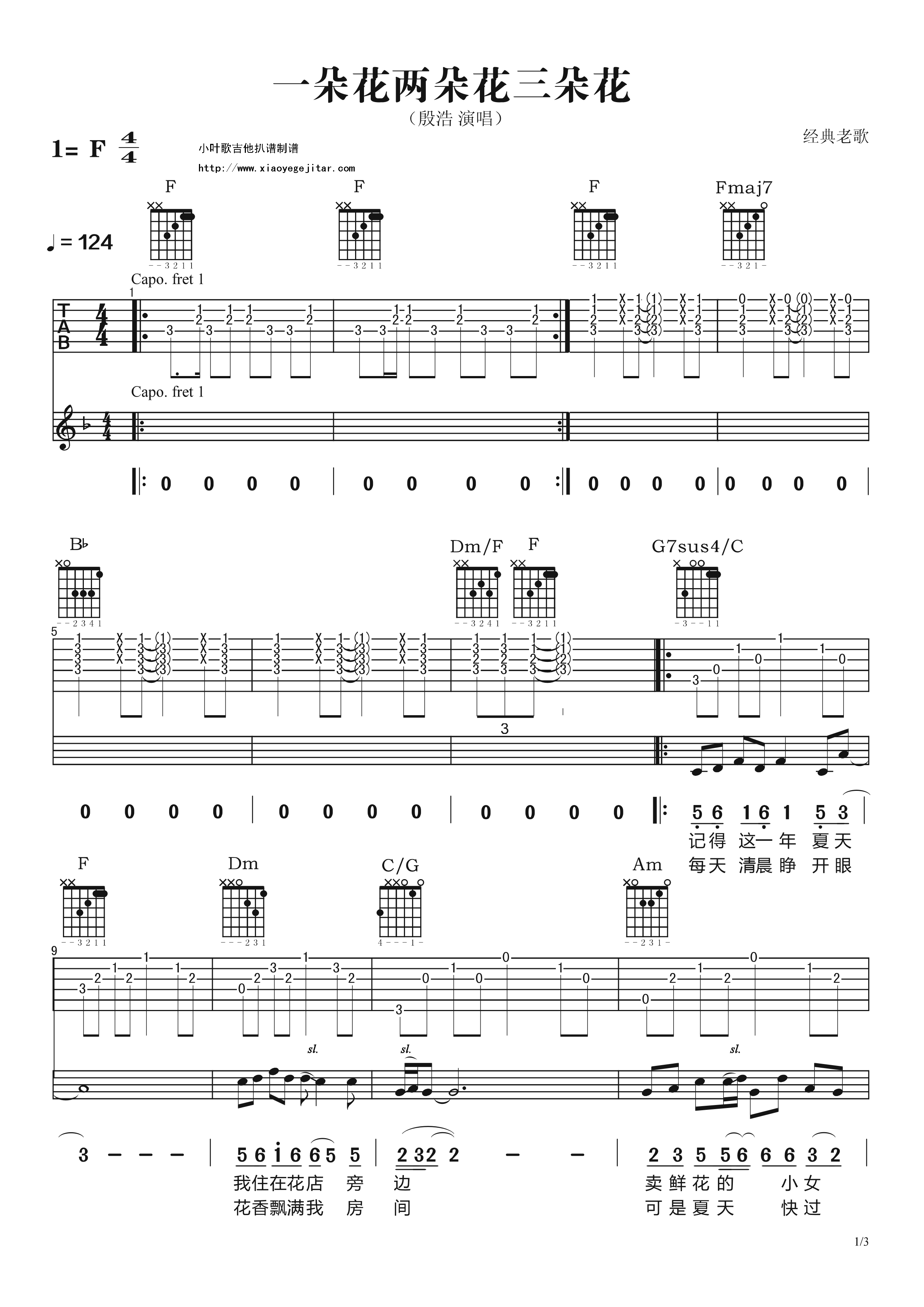 殷浩《一朵花两朵花三朵花》吉他谱,小叶歌编配出品,共有3张高清图谱。...