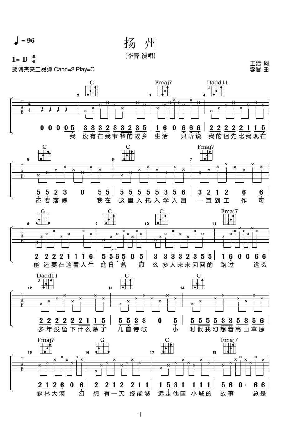 扬州吉他谱,李晋词曲创作演唱,选用C调指法编配,CAPO2品。琴友们弹唱的时候,把这首歌改成自己的家乡,也都有一番风味。一首关于城市的民谣歌曲,属于我们每个人的“扬州”,我在这里度过了人生的小半,也将会在这里静看人生的日落。就算我去过这世间再多的角落,也只有踏着它身上的灰尘与落叶...
