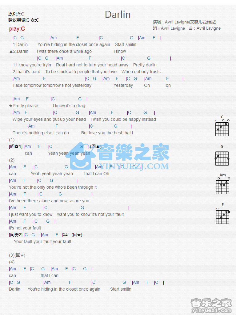 C调版艾薇儿《Darlin》吉他和弦弹唱谱...