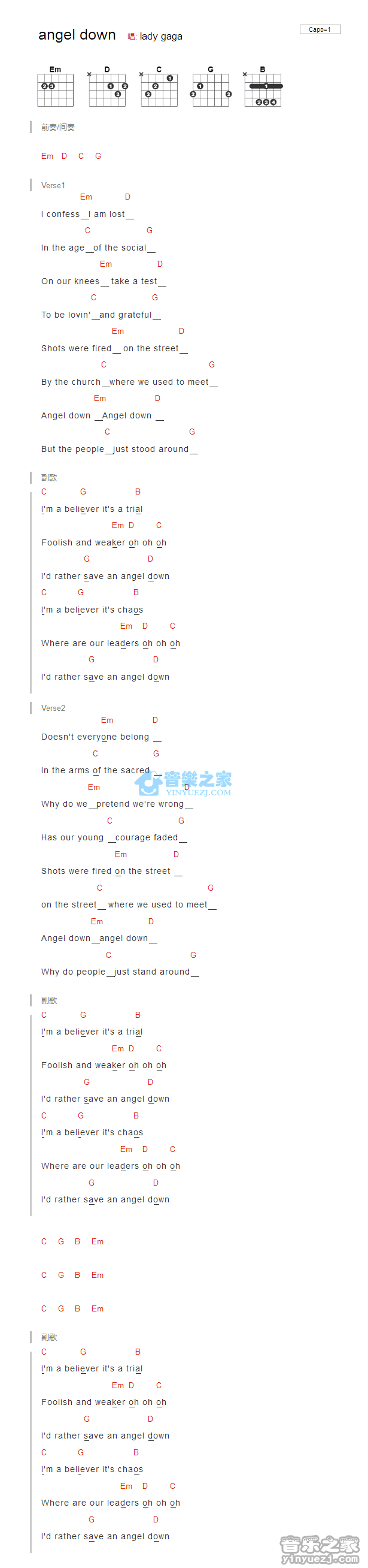 吉他LadyGaga《Angel Down》吉他谱 - 非常多人都在弹的版本