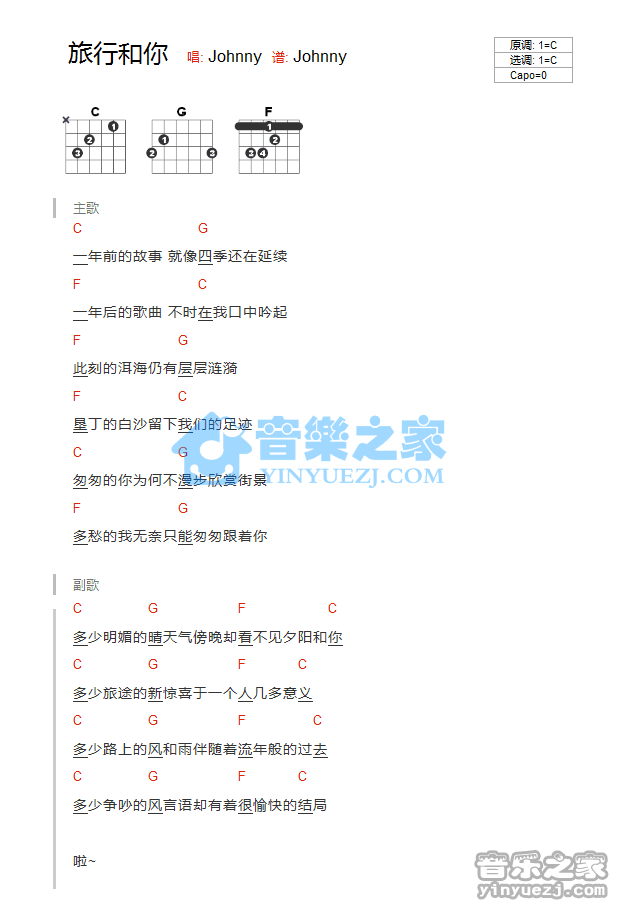 C调版Johnny《旅行和你》吉他和弦弹唱谱...