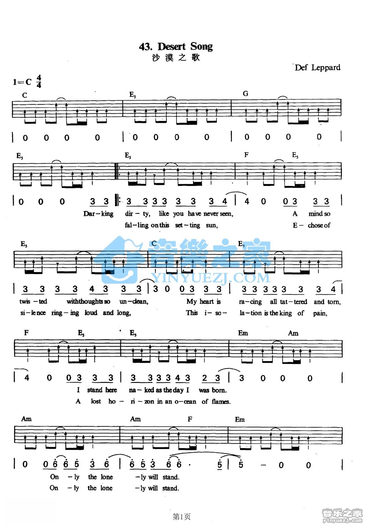 C调版DefLeppard《DesertSong》吉他弹唱六线谱...