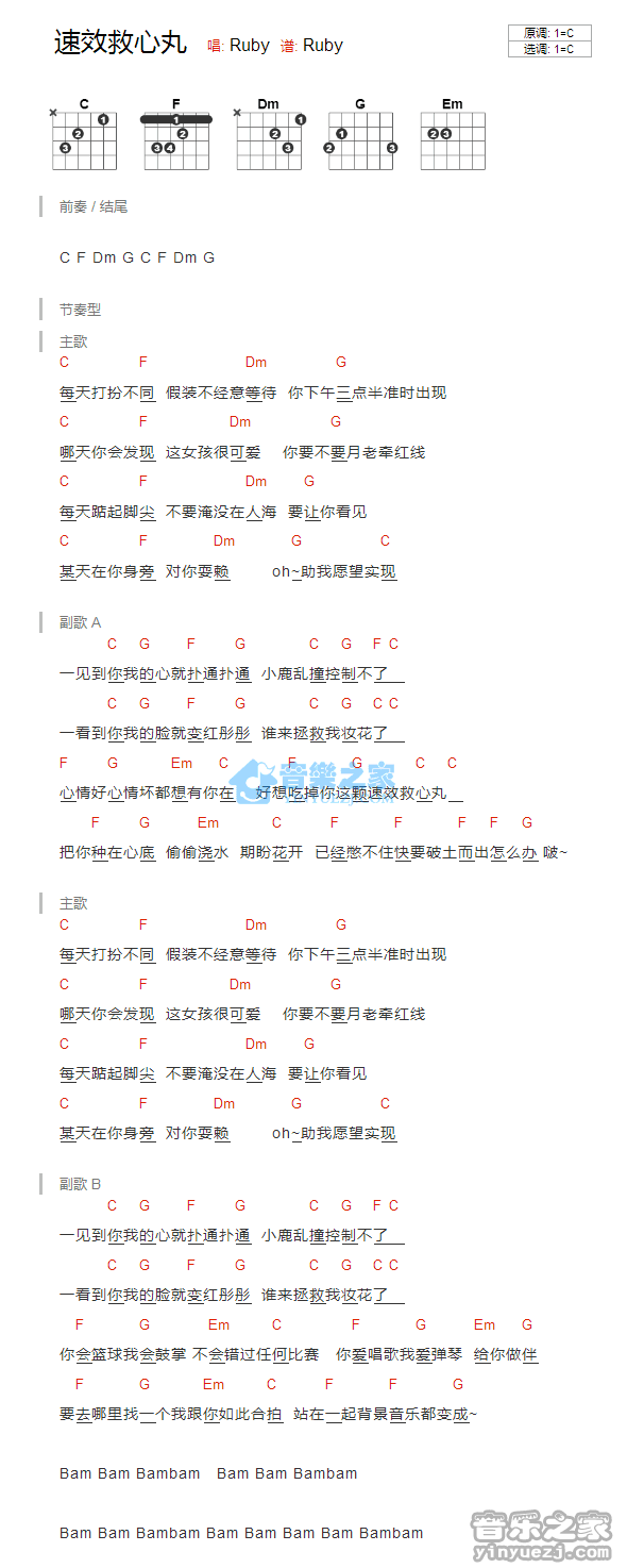 C调版Ruby《速效救心丸》吉他和弦弹唱谱...