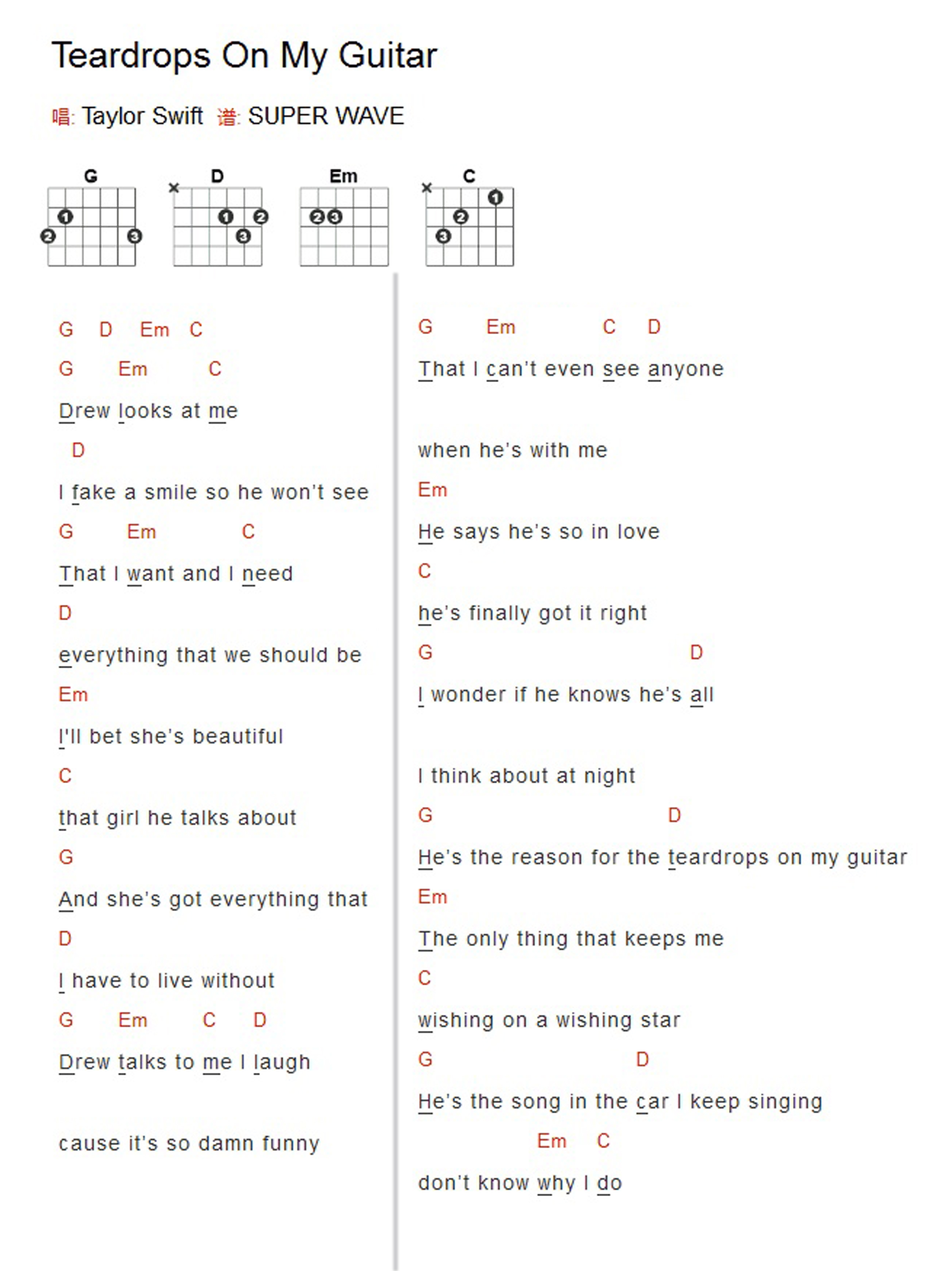 TaylorSwift《TearDropsOnMyGuita》吉他和弦弹唱谱...