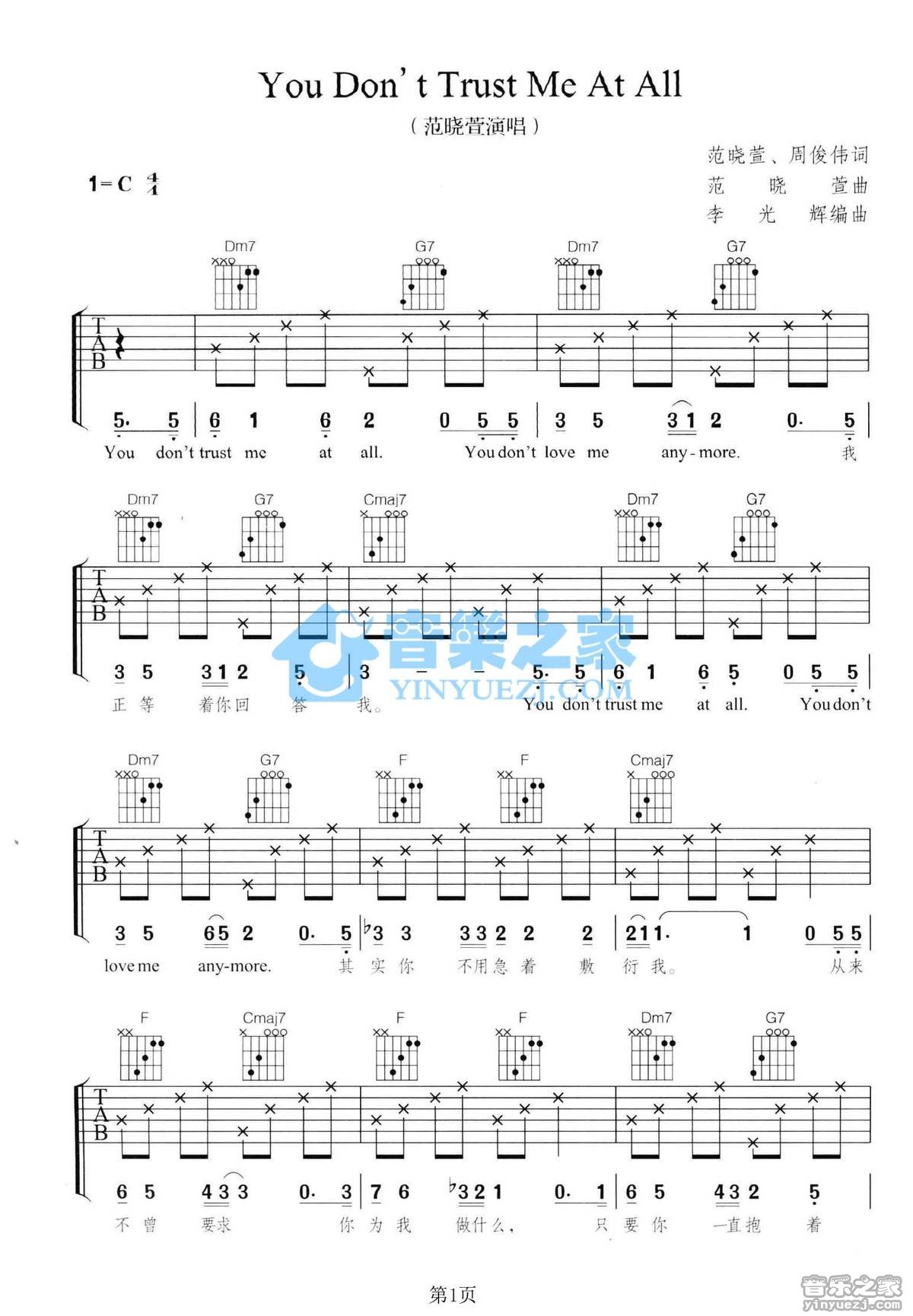 C调版范晓萱《YouDon'tTrustMeAtAll》吉他弹唱六线谱...